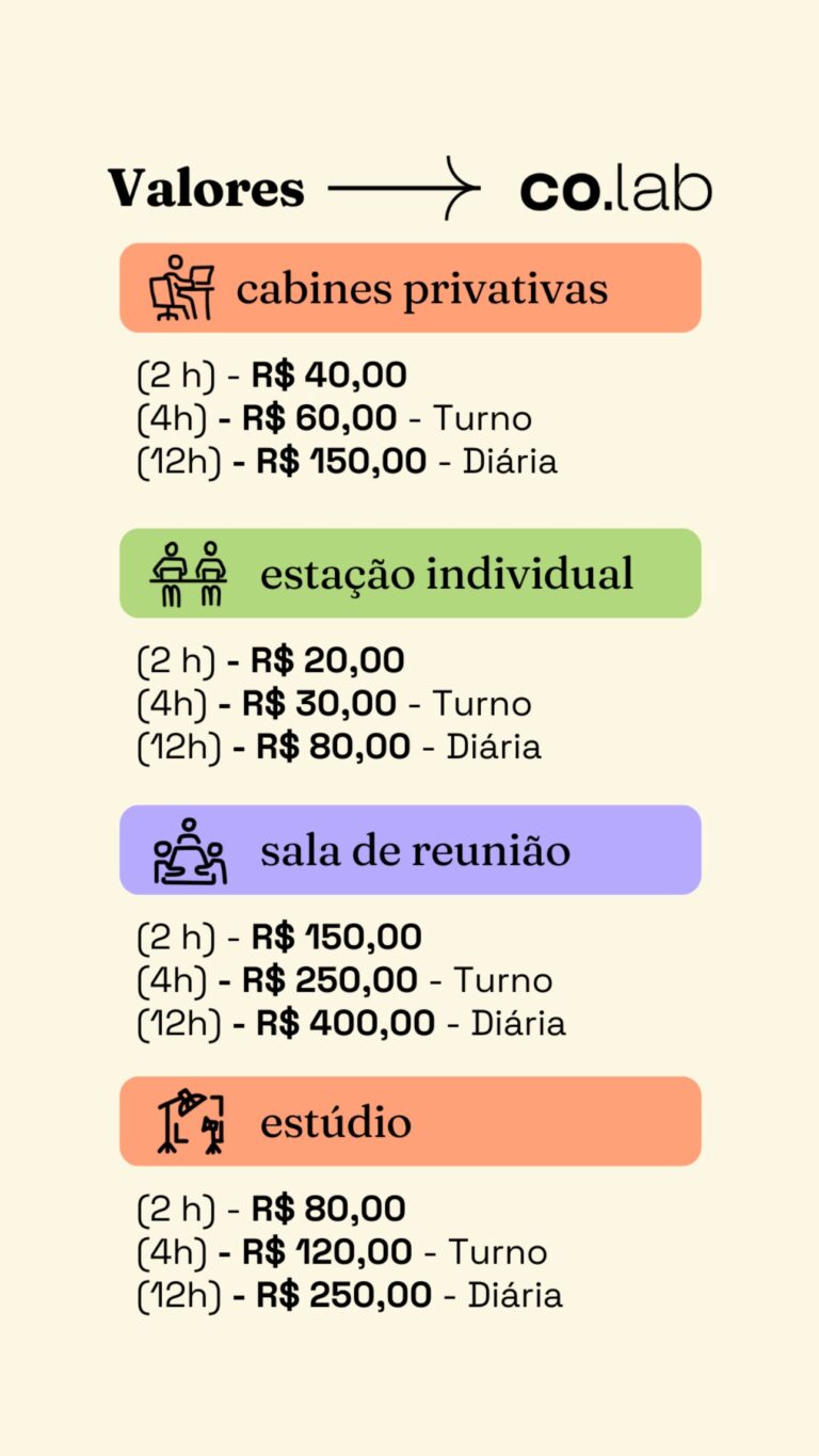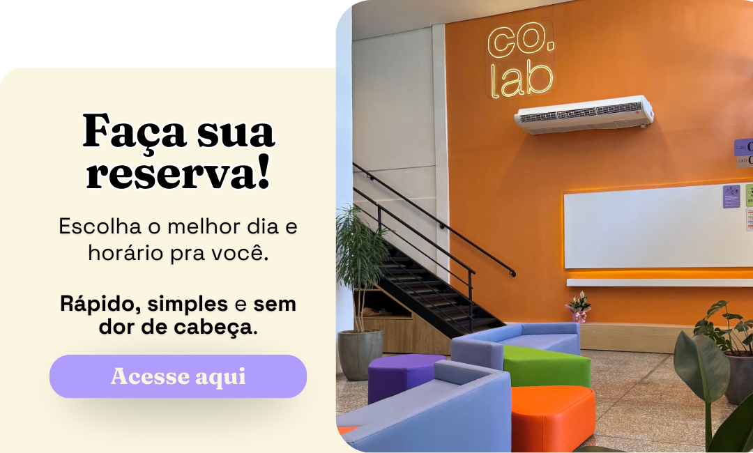 Aqui na Co.Lab a palavra de ordem é liberdade! Não trabalhamos com mensalidades fixas ou contratos burocráticos. Nosso espaço é rotativo, pensado para que você use exatamente o tempo que precisar — seja por algumas horas, um turno ou o dia inteiro.